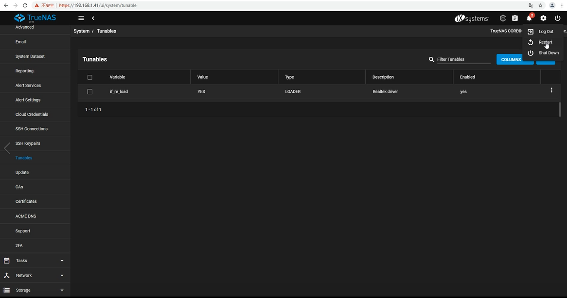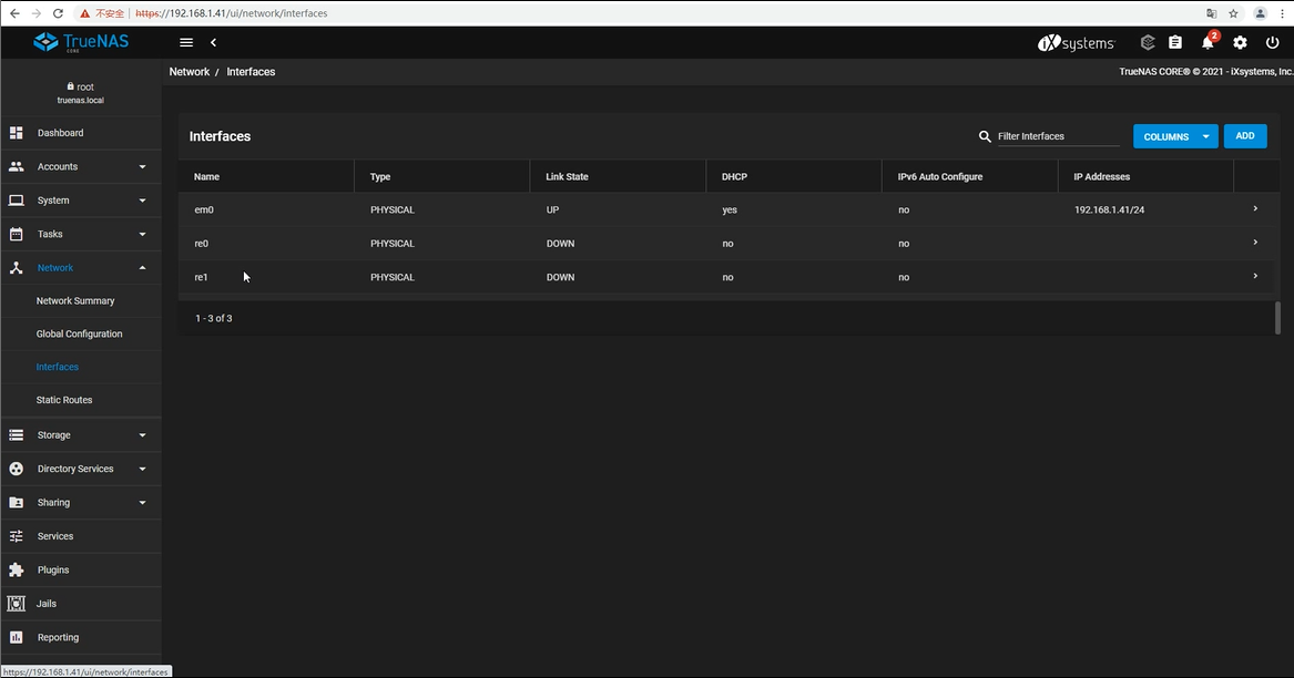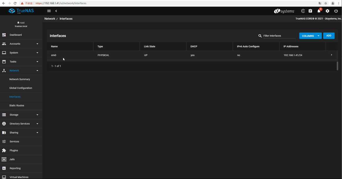 2.进入后台后打开网络-接口,看到只有一块集成网卡显示,8125B网卡没有显示出来
