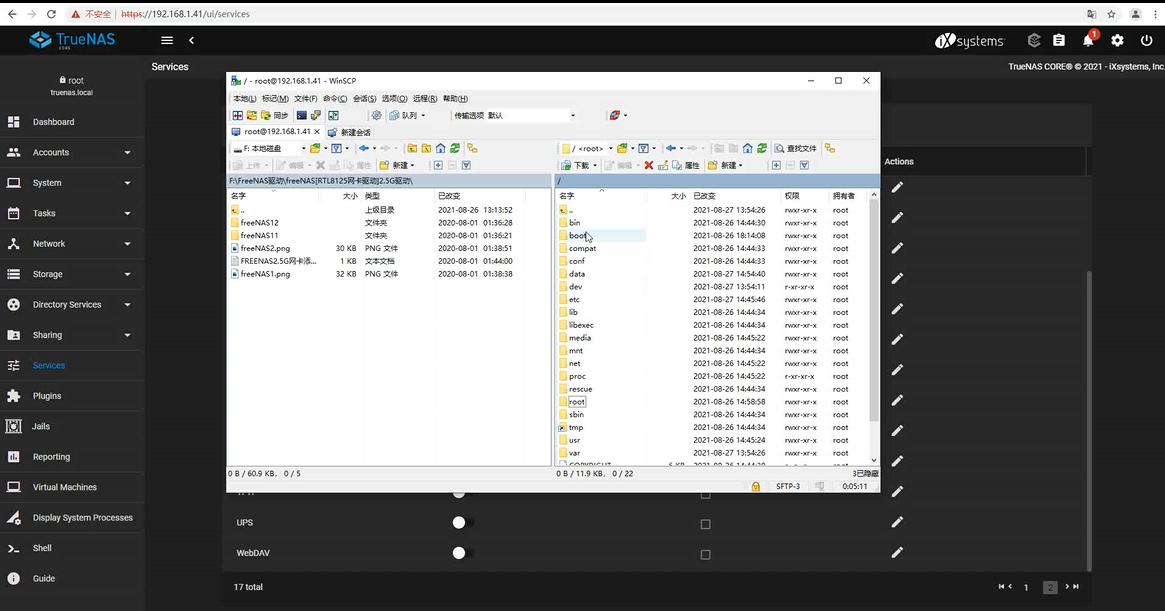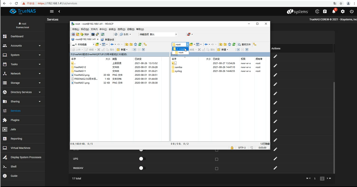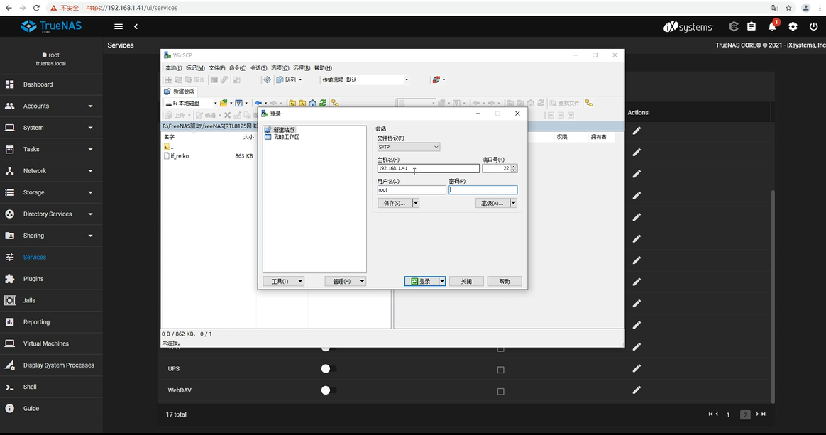 5.打开WinSCP工具,输入FreeNAS的ip地址和用户名密码登录